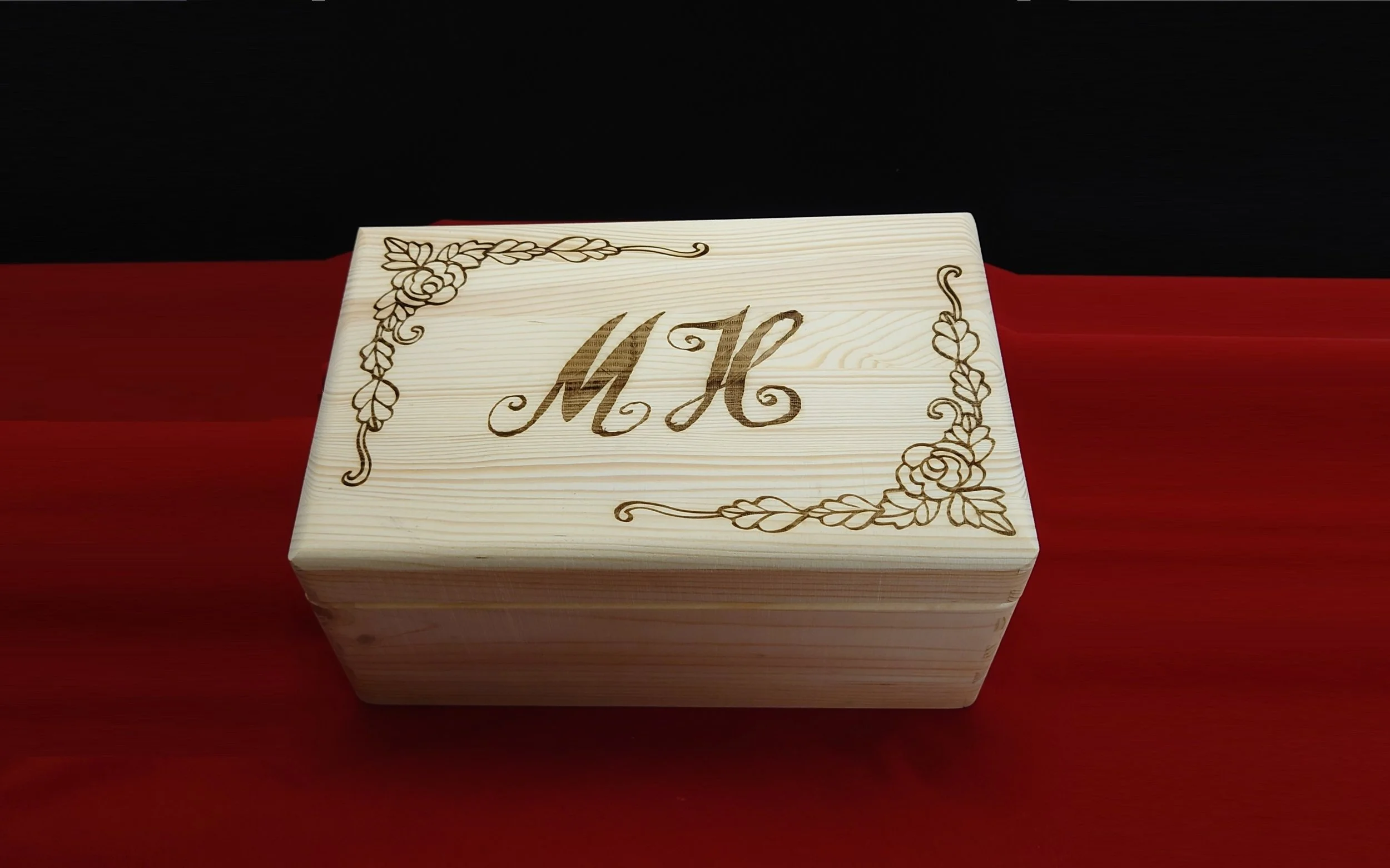 A pine wood box with a latch, featuring a custom-engraved lid. The engraving can include a name, initials, or other text of your choice.